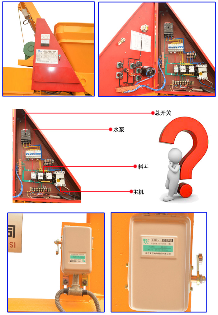 JS500攪拌機電控系統有空氣開關、熔斷器、熱繼電器,有短路保護、過載保護的功能。所有控制按鈕及空氣開關手柄和指示燈均在配電箱門上,并設有門鎖。按鈕上有防護罩。配電箱內的電器元件裝在一塊緣板上,安全可靠,操作維修方便。